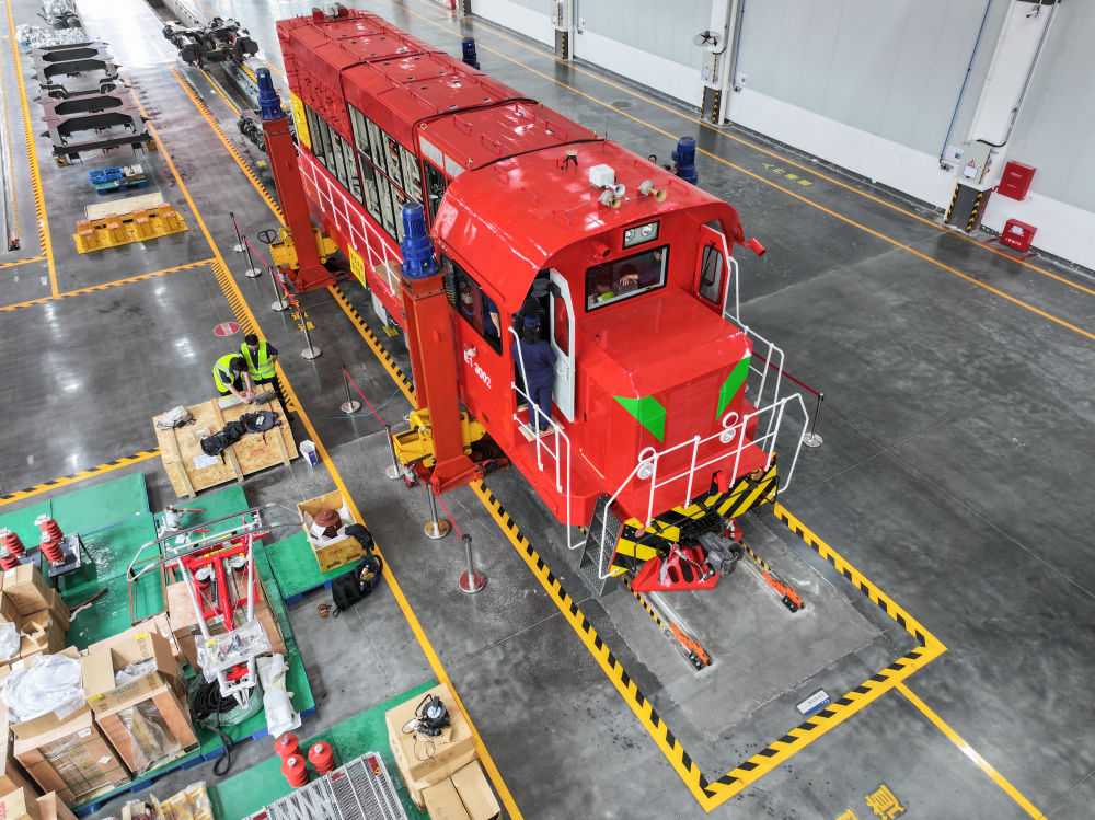 这是4月26日在湖南株洲联诚集团控股股份有限公司新产业事业部车间拍摄的一台准备改造成新能源的机车(无人机照片)。新华社记者 陈泽国 摄