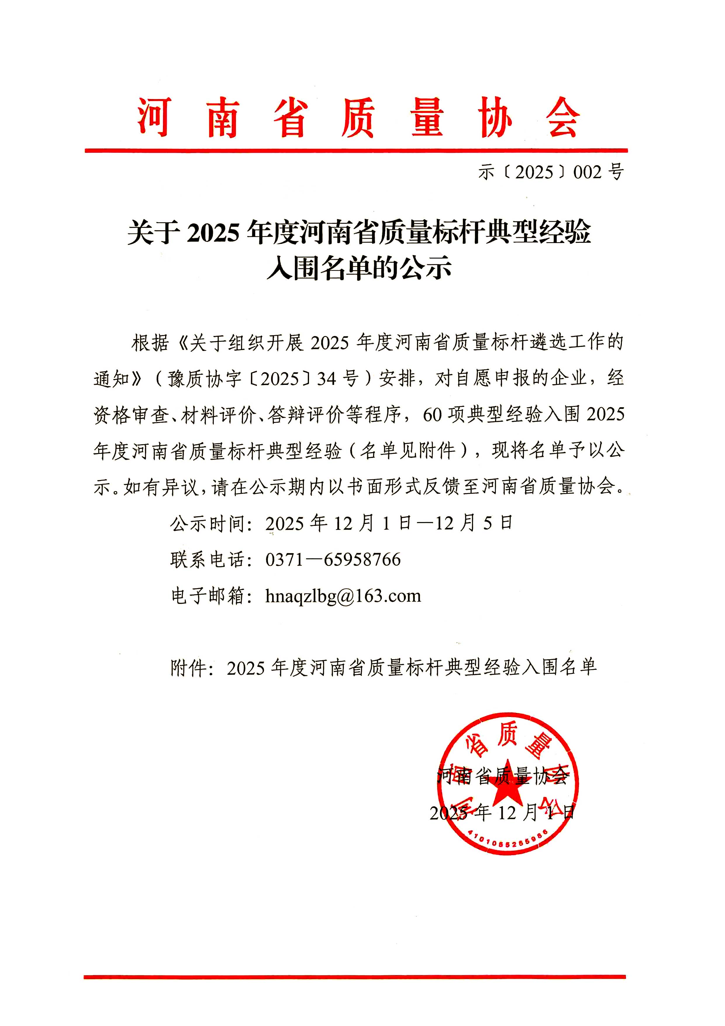 关于2025年度河南省质量标杆典型经验入围名单的公示